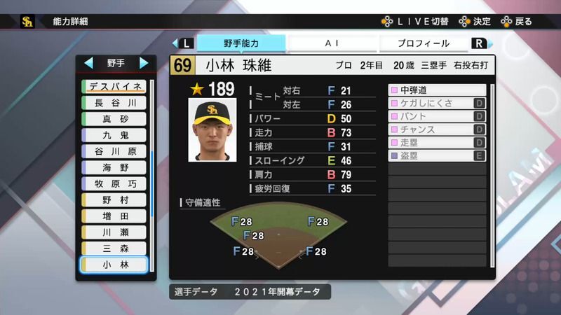 プロスピ2021(プロ野球スピリッツ2021)の小林 珠維の実在選手データです。能力、基本ステータス、特殊能力などの選手データをまとめています。