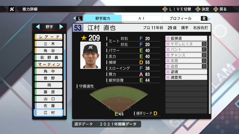 | ミート対右 | ミート対左 | パワー | 走力 |