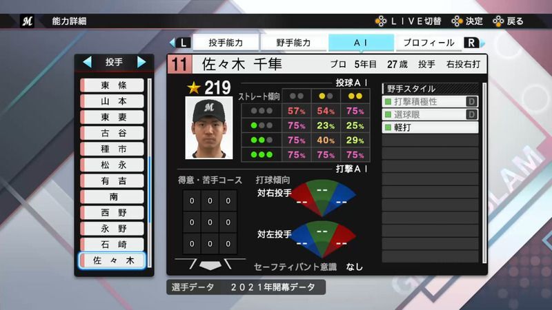【プロスピ2021】佐々木 千隼選手の能力