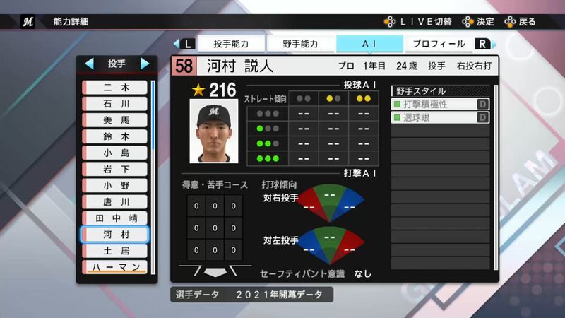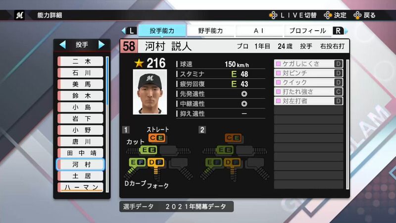 | 変化量 球威 制球 | C E | 1 E E | 4 E F | 4 D F | ||