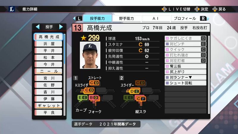 | 変化量 球威 制球 | C D | 3 C D | 2 E E | 3 B D | ||