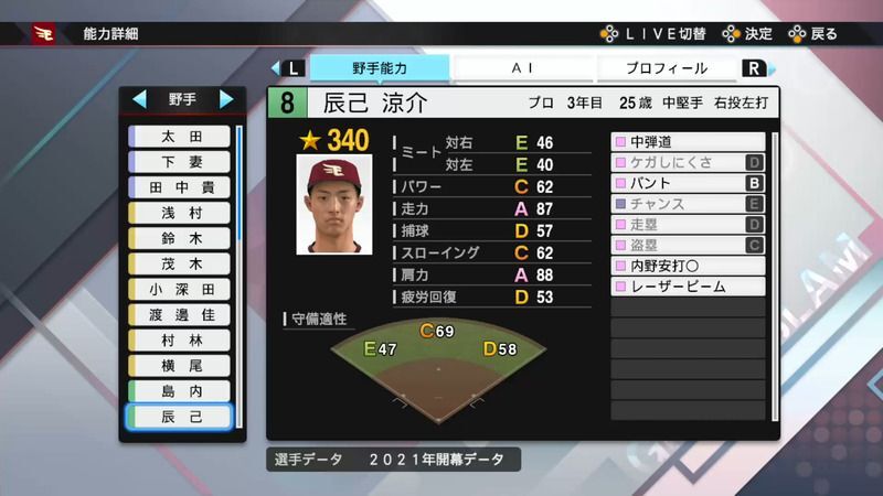 プロスピ2021(プロ野球スピリッツ2021)の辰己 涼介の実在選手データです。能力、基本ステータス、特殊能力などの選手データをまとめています。