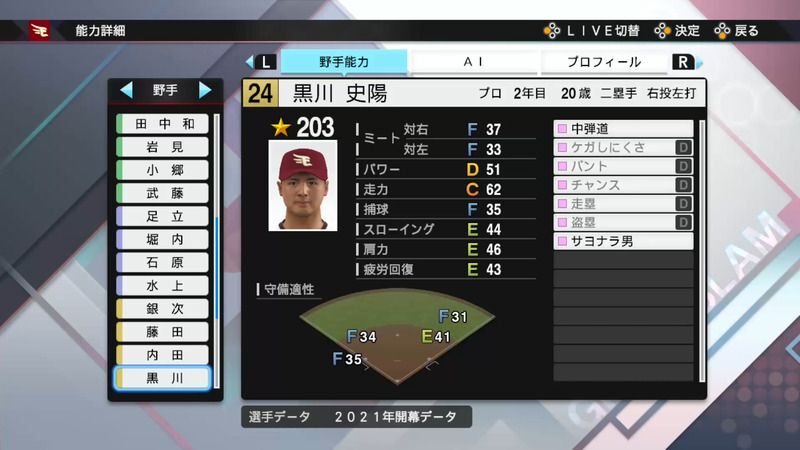 プロスピ2021(プロ野球スピリッツ2021)の黒川 史陽の実在選手データです。能力、基本ステータス、特殊能力などの選手データをまとめています。