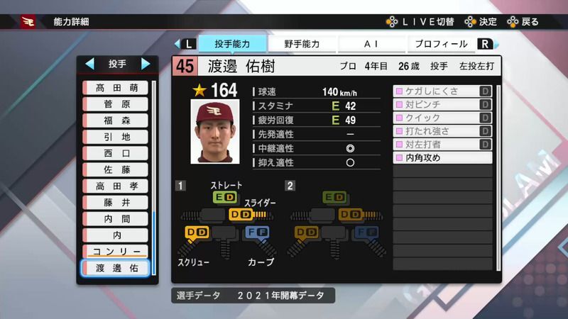 | 変化量 球威 制球 | E D | 2 D D | 2 F F | 5 D D | ||