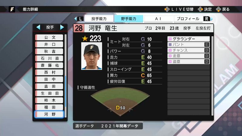 | 変化量 球威 制球 | E D | 2 D D | 3 C D | 2 E E | ||