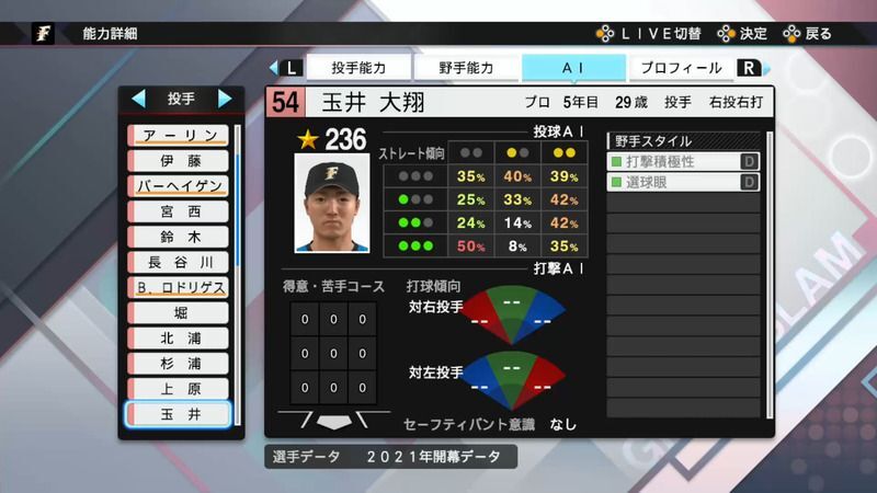 プロスピ2021 玉井 大翔のステータス
