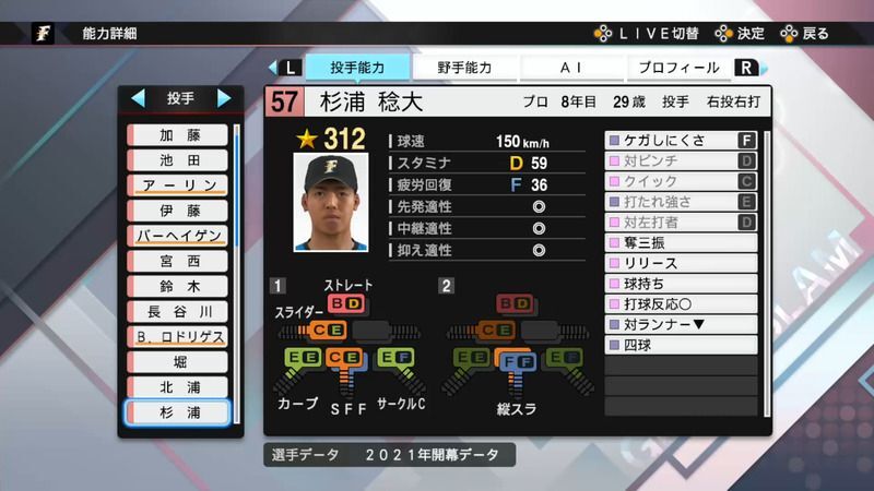 | 変化量 球威 制球 | B D | 3 C E | 3 E E | 4 C E | 3 E F | |