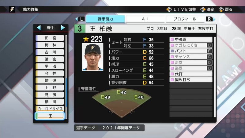 プロスピ2021 王 柏融の選手能力