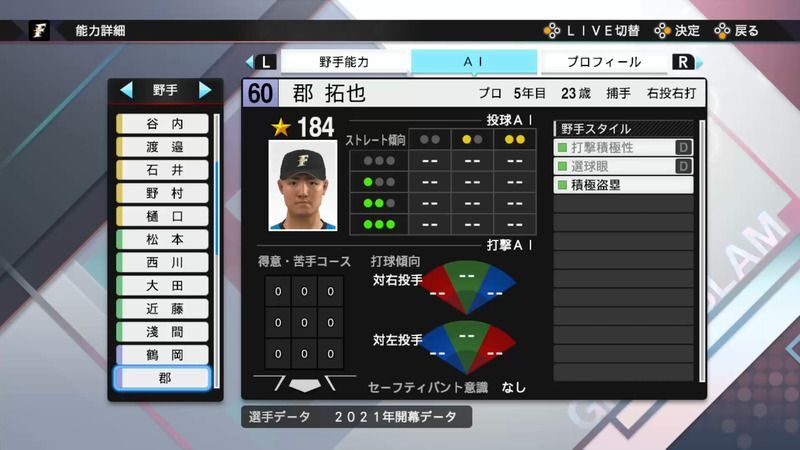 | ■打撃積極性 D | ■選球眼 D | ■積極盗塁 |