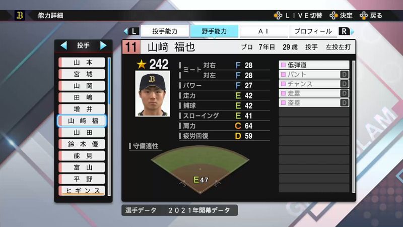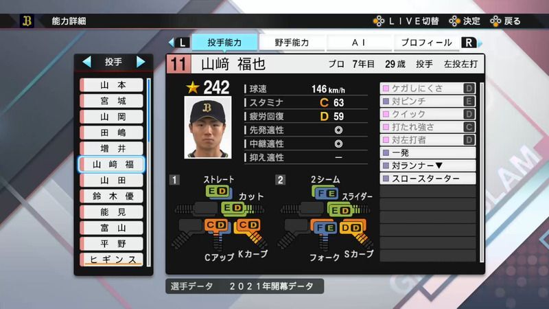 【プロスピ2021】山﨑 福也選手の能力