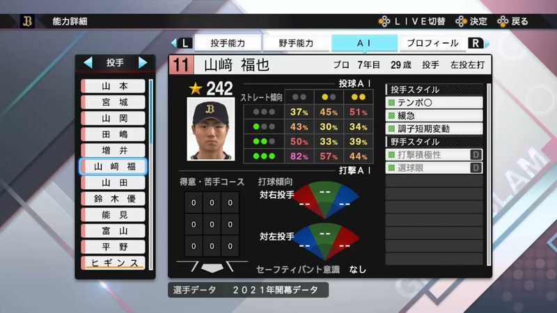 プロスピ2021 山﨑 福也のステータス