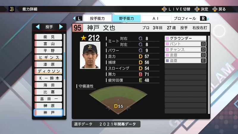 プロスピ2021 神戸 文也の選手能力