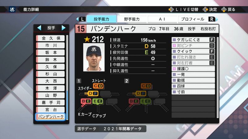 プロスピ2021 バンデンハークの選手能力