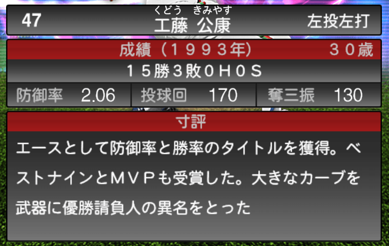 プロスピA(プロ野球スピリッツエース)の工藤 公康選手能力と評価をまとめています。能力値や特殊能力だけではなく、選手評価、おすすめ称号、選手の成績なども紹介しています。