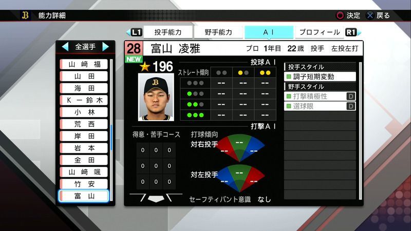 【プロスピ2019 PS4・Vita】富山 凌雅の選手能力