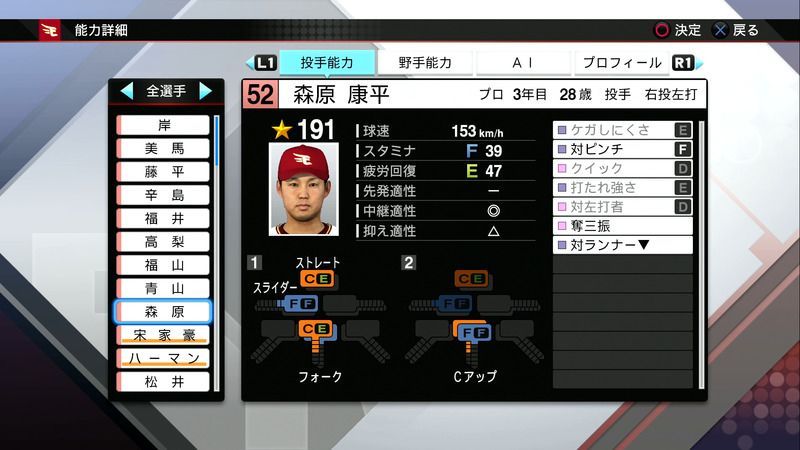 【プロスピ2019 PS4・Vita】森原 康平の選手能力