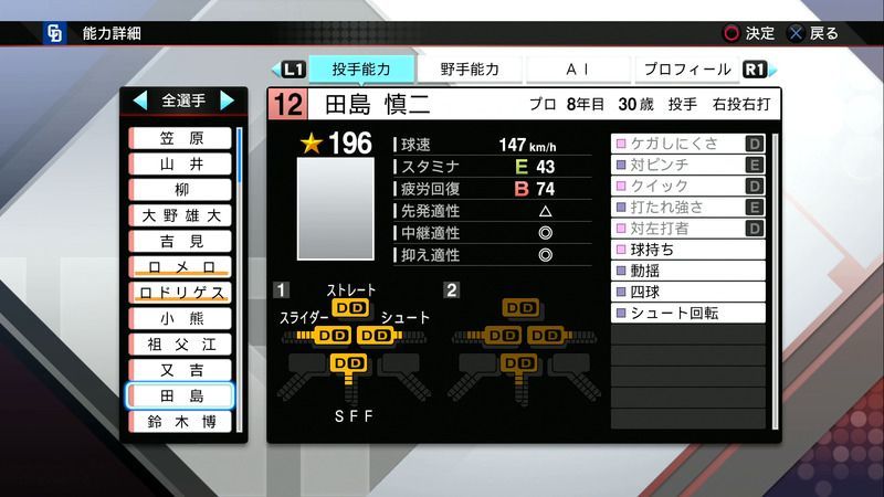 【プロスピ2019 PS4・Vita】田島 慎二の選手能力