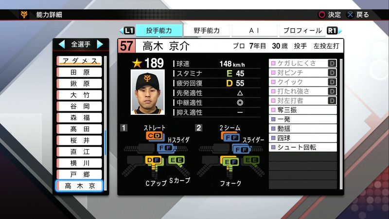 【プロスピ2019 PS4・Vita】高木 京介の選手能力