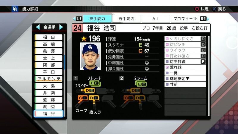 【プロスピ2019 PS4・Vita】福谷 浩司の選手能力