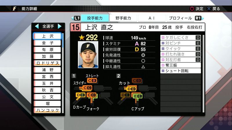 【プロスピ2019 PS4・Vita】上沢 直之の選手能力