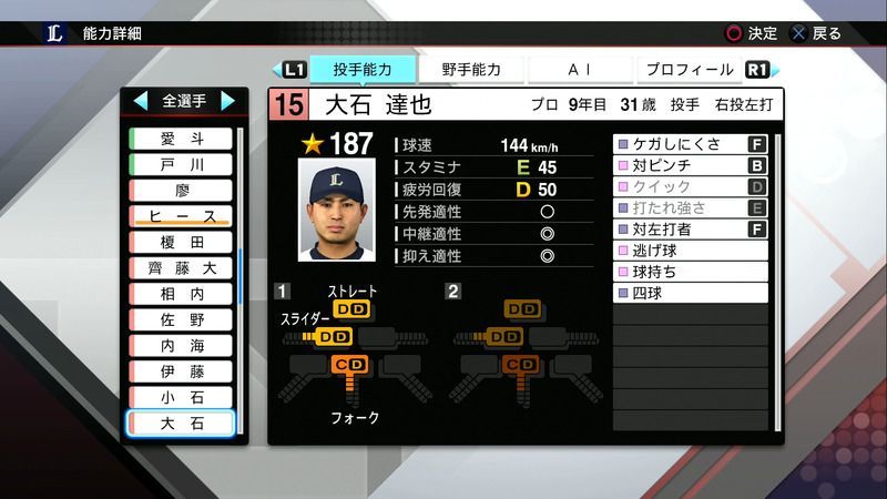 【プロスピ2019 PS4・Vita】大石 達也の選手能力