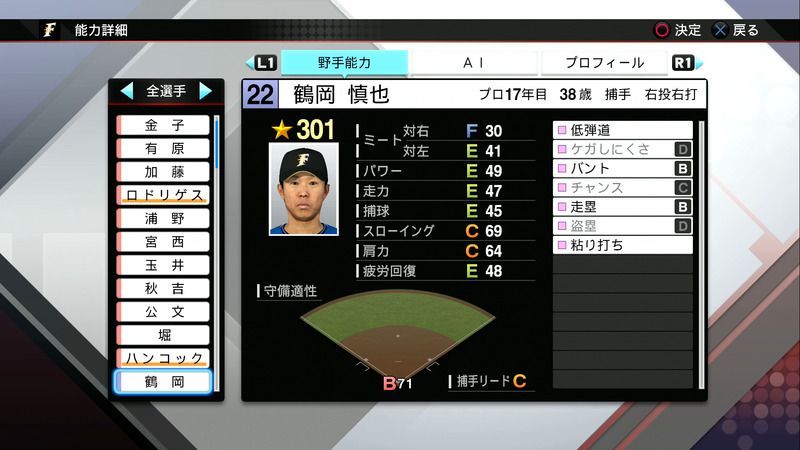 【プロスピ2019 PS4・Vita】鶴岡 慎也の選手能力