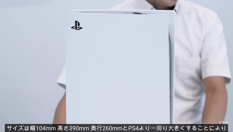 PS5のサイズは幅104mm 高さ390mm 奥行き260mmとPS4よりひとまわり大きくすることにより、処理能力や静音性の面で飛躍的な性能向上を実現しました。