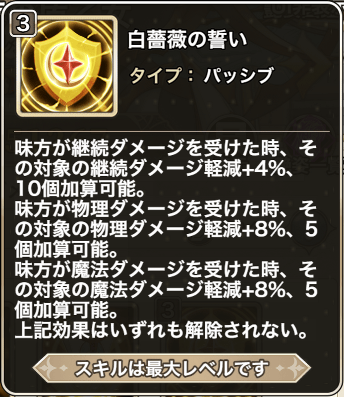 ![]() | 白薔薇の誓い 【パッシブ】 味方が継続ダメージを受けた時、 その対象の継続ダメージ軽減+4%、10個加算可能。 味方が物理ダメージを受けた時、 その対象の物理ダメージ軽減+8%、5個加算可能。 味方が魔法ダメージを受けた時、 その対象の魔法ダメージ軽減+8%、5個加算可能。 上記効果はいずれも解除されない。 |