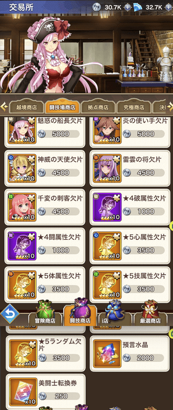 ![]() | ・ホーム >交易所 >美闘士商店タグ >闘技場商店タグ 冒険者Lv17解禁 交換:闘技場硬貨 (入手:闘技場 戦闘(10)、毎日・日曜21:00順位報酬) ・[技]金魚姫欠片×10(6000) 2024/2追加 ・[体]ハーレムの笛吹き欠片×10(6000) 2024/2追加 ・[心]氷菓姫欠片×10(6000) 2024/2追加 ・[破]魅惑の船長欠片×10 (5000) ・[闇]炎の使い手欠片×10 (5000) ・[心]神威の天使欠片×10 (4500) ・[体]雷雲の将欠片×10 (4500) ・[技]千変の刺客欠片×10 (4500) ・★4[破闇]属性欠片×10 (1000) ・★5[心技体]属性欠片×10 (3500) ・★5ランダム欠片×10 (3500) ・預言水晶 (2000) ・美闘士転換券 (250) |