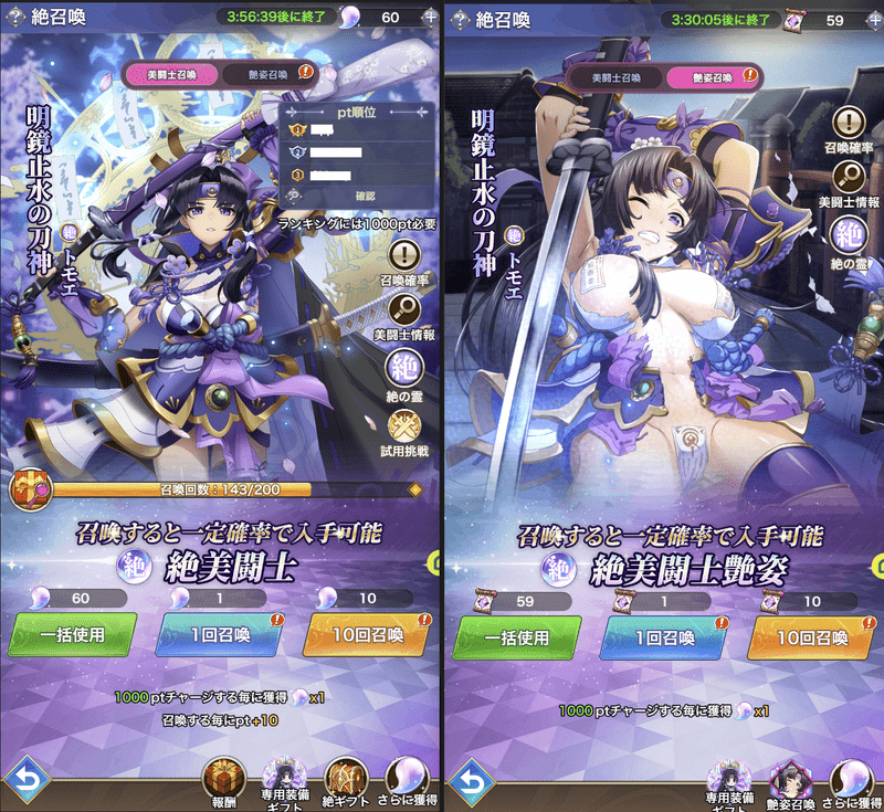 ![]() | ・ホーム左上 >絶召喚 (2022年は、課金でしか絶宝玉を入手できなかった) 【上】美闘士召喚、艶姿召喚 【右】召喚確率、美闘士情報、絶の霊、試用挑戦 【中】プレゼント箱(召喚回数報酬) 【下】報酬、専用装備ギフト、絶ギフト、艶姿召喚、さらに獲得 使用:絶宝玉(入手:絶美闘士) 艶姿収集書(入手:絶美闘士の艶姿) |