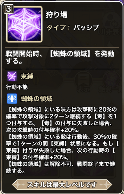 ![]() | 狩り場 【パッシブ】戦闘開始時、【蜘蛛の領域】を発動する。 ●束縛 行動不能 ●蜘蛛の領域 【蜘蛛の領域】にいる味方は攻撃時に20%の確率で攻撃対象に2ターン継続する【毒】を1つ付与する。 【毒】の付与に失敗した場合、次の攻撃時の付与確率+20%。 【蜘蛛の領域】にいる敵は行動後、30%の確率で1ターンの間【束縛】状態になる。 もし【束縛】付与が失敗した場合、次の行動時の【束縛】の付与確率+20%。 【蜘蛛の領域】は解除不可、戦闘終了まで継続する。 |