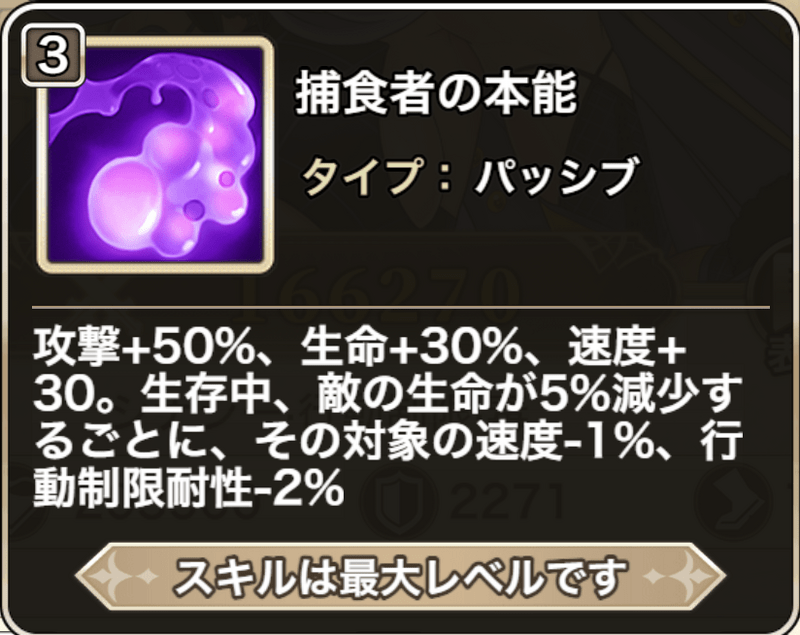 ![]() | 捕食者の本能 【パッシブ】 攻撃+50%、生命+30%、速度+30。 生存中、敵の生命が5%減少するごとに、その対象の速度-1%、行動制限耐性-2 |