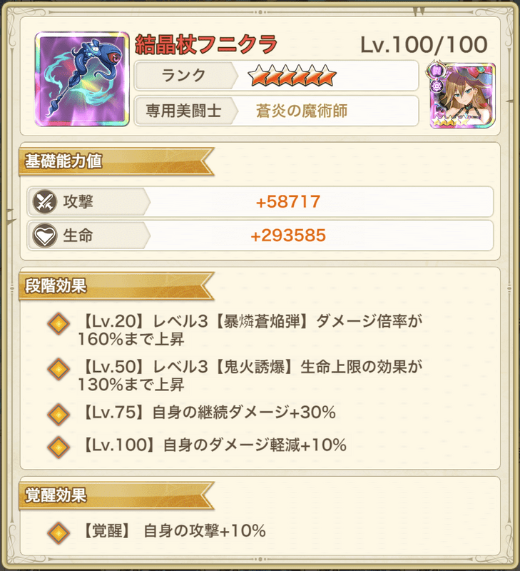 ![]() | 蒼の鬼火 【パッシブ】 攻撃+50%、生命+30%、継続ダメージ+20%。 敵に【呪い】が付与されると、60%の確率で【鬼火・呪】を1個付与。 1ターンに各美闘士は最大3個まで付与できる。 敵に【毒】が付与されると、60%の確率で【鬼火・毒】を1個付与。 1ターンに各美闘士は最大3個まで付与できる。 効果は場にいる場合のみ適用される。 ●鬼火・呪 対象が受ける【呪い】ダメージ+10%、 継続ターン終了、解除、または消費時に、発動者の攻撃70%分の生命を失う。 5個まで加算可能、2ターン継続。 ●鬼火・毒 対象が受ける【毒】ダメージ+10%、 継続ターン終了、解除、または消費すると最大生命7%分を損失する。 攻撃1000%を超えない。 5個まで加算可能、2ターン継続する。 |