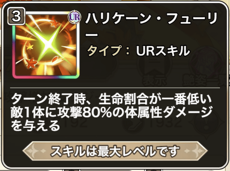 ![]() | ハリケーン・フューリー ターン終了時、生命割合が一番低い敵1体に 攻撃80%の体属性ダメージを与える |