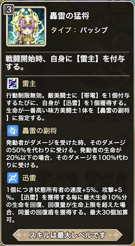![]() | 轟雷の猛将 【パッシブ】 戦闘開始時、 自身に【雷主】を付与する。 ●雷主 行動制限無効。 敵美闘士に【帯電】を1個付与するたびに、 自身が【迅雷】を1個獲得する。 生命が一番高い味方美闘士1体を【轟雷の副将】に指定する。 ●轟雷の副将 発動者がダメージを受けた時、 そのダメージの50%を代わりに受ける。 発動者の生命が20%以下の場合、 そのダメージを100%代わりに受ける。 ●迅雷 1個につき状態所有者の速度+5%、攻撃+5%。 【迅雷】を獲得する毎に最大生命10%分の生命を回復、 回復量が生命上限を超えた場合、 同量の回復盾を獲得する。最大30個加算可。 |