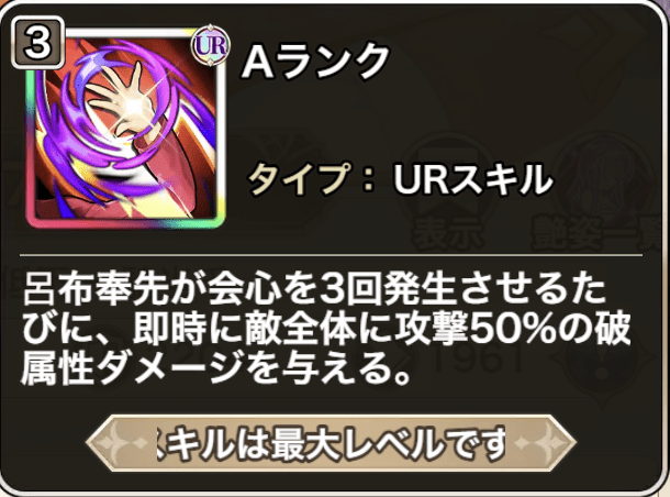![]() | Aランク 呂布奉先が会心を3回発生させるたびに、 即時に敵全体に攻撃50%の破属性ダメージを与える。 |