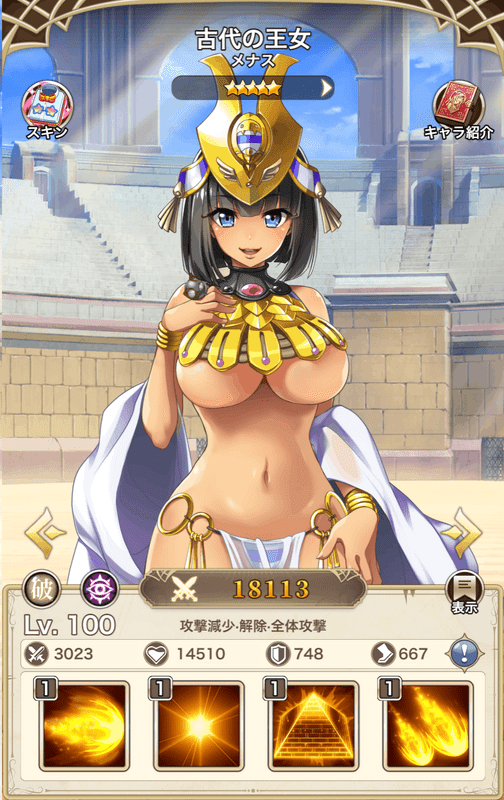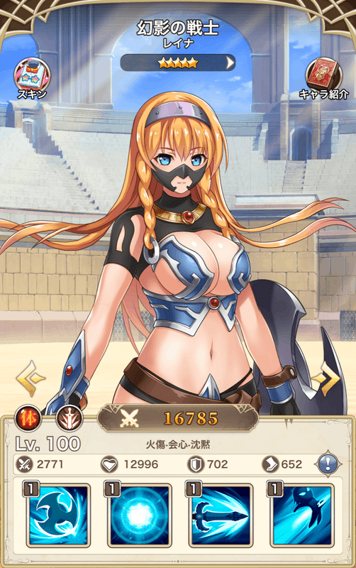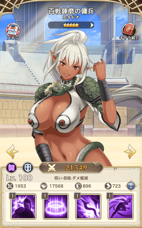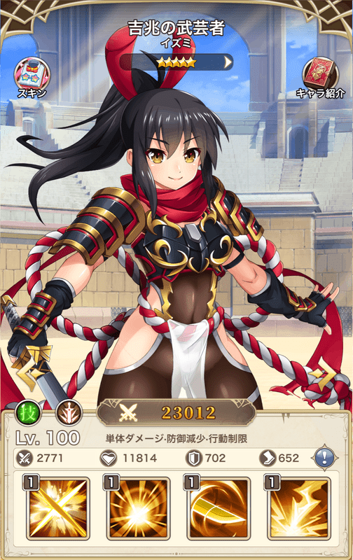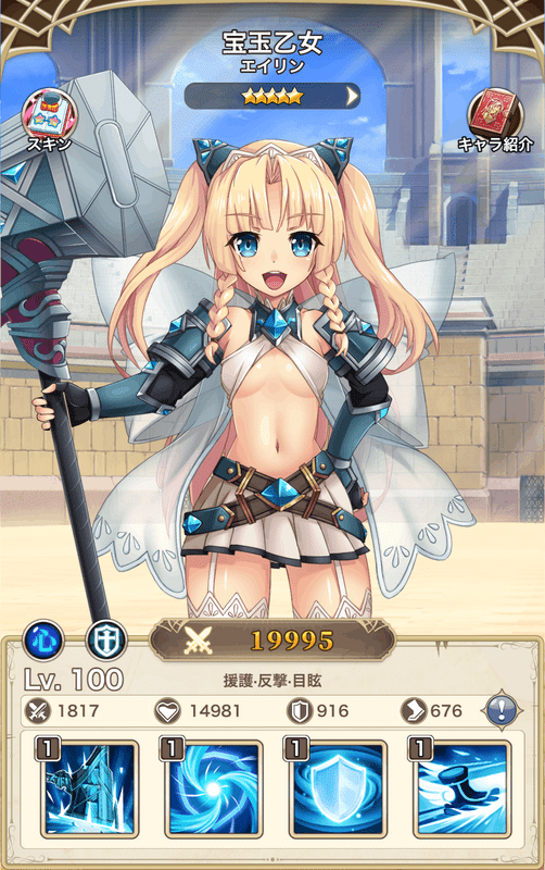 | 技 | 攻撃減少・全体回復・バフ | 攻撃減少・解除・全体攻撃 | 挑発・盾 【素材用】 | 連撃・回復低下 【素材用】 |