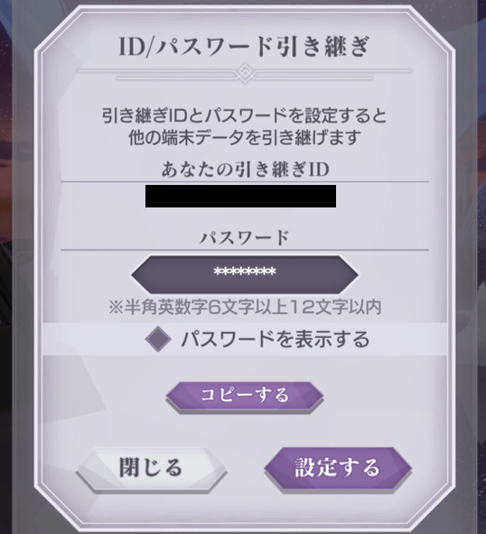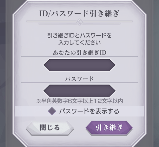 自分のIDと設定したパスワードを設定することでアカウントの引継ぎが完了します。