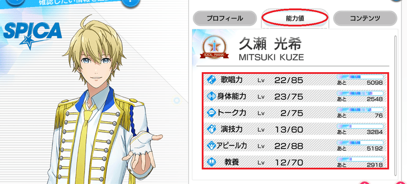 Readyyy!(レディ)の能力値は、アイドル一人一人に設定されている能力の値で、「ホーム」→「アイドル」→「能力値」から確認することが出来ます。