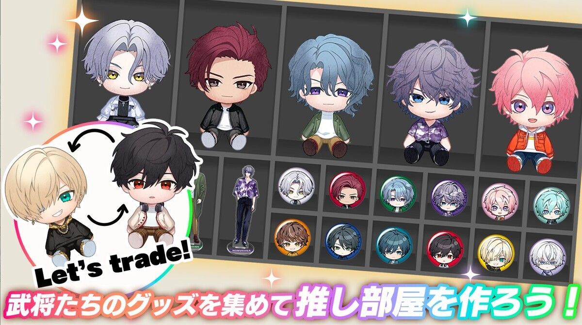 12人の武将の中から、1日一回「トーク」が届くのですが、現代の渋谷に降臨した彼らには不自由なことが多く、ひょっとしたら悩み事の相談もあるかもしれません。その他にもコレクション要素として自分で推しのデジタルグッズを集めたり、全国のファンとトレードして、自分だけの『推し部屋』を作ったりと、さまざまな面で武将たちとの交流がありそうです。武将×アイドル×リズムゲームというありそうでなかったこの組み合わせは今後の展開に期待したいですね。