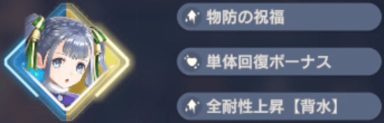 | 単体回復ボーナス | 単体回復が与えるHP回復量2〜15%アップ |