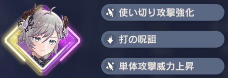 | 使い切り攻撃強化 | 使用回数が1回の時、ダメージ5~45%アップ |