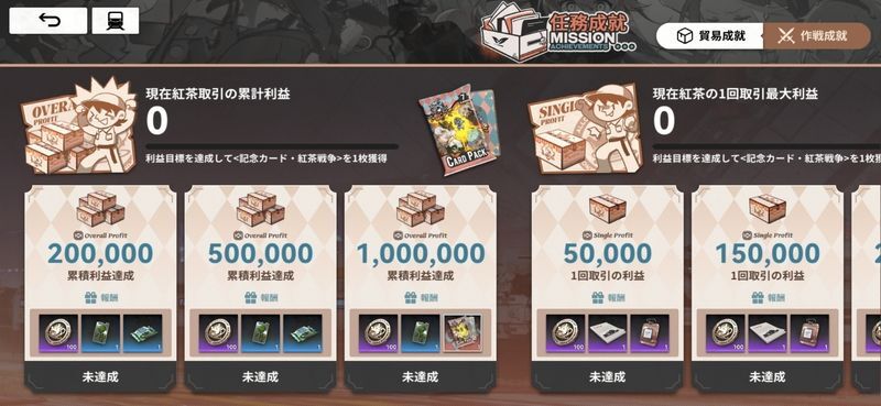 ※「紅茶1回取引最大利益250,000達成」という任務成就があるので一度は大量に売りましょう