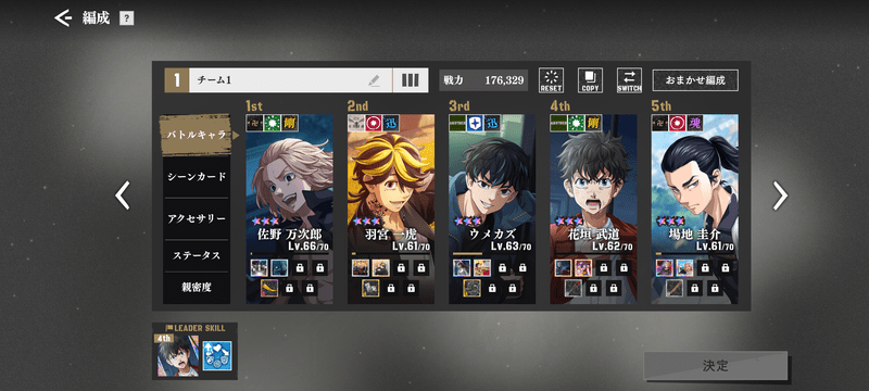 アタッカー3人に詰めるウメカズリーダー編成作ったけど…シーンカード問題で火力が東卍編成って方が出たから、東卍編成だけでいいわってなったわ笑