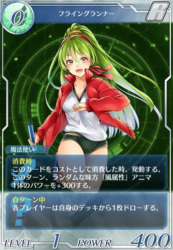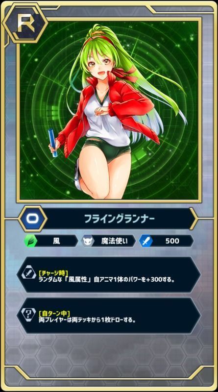 アシスト効果は相互ドロー。相手が手札を使い切った直後に発動するもよし、風属性アニマを出す直前に発動するもよし、手札を5枚持っているときに発動してエナジーを2枚増やすもよし、である。もちろん手札が悪いときにも。