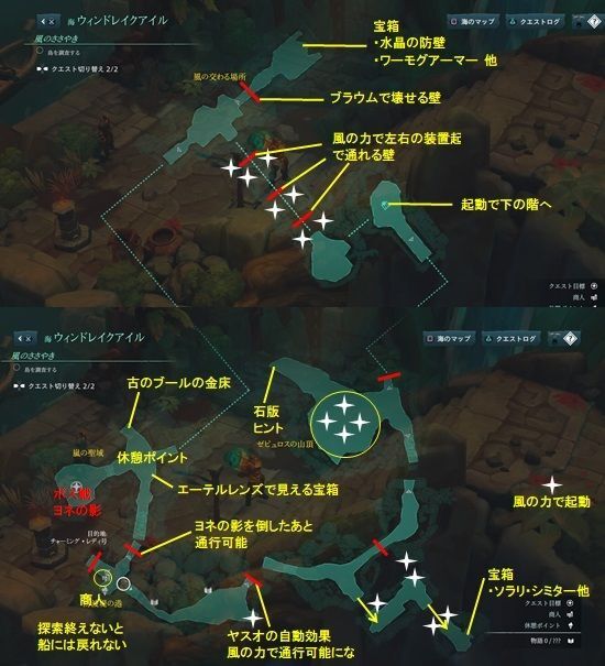 ![]() 装置を動かすと進める様になる ![]() ・イラオイで石版読むとヒント (北→西→東→南) ・「風のカエデの種」(ヤスオ伝説武器素材)他 ![]() ・足場を動かす装置の左右に風で起動するポイント 風の力で壁をどかして奥へ進む ・MAP右上、ブラウムで壊せる壁 宝箱:水晶の防壁、ワーモグアーマー他 ・先に進むと休憩ポイント ・古のブールの金床(レシピ) 山頂のギミックを終えていれば起動できる ・エーテルレンズで見える宝箱 (クランマスターの奥の手) | |