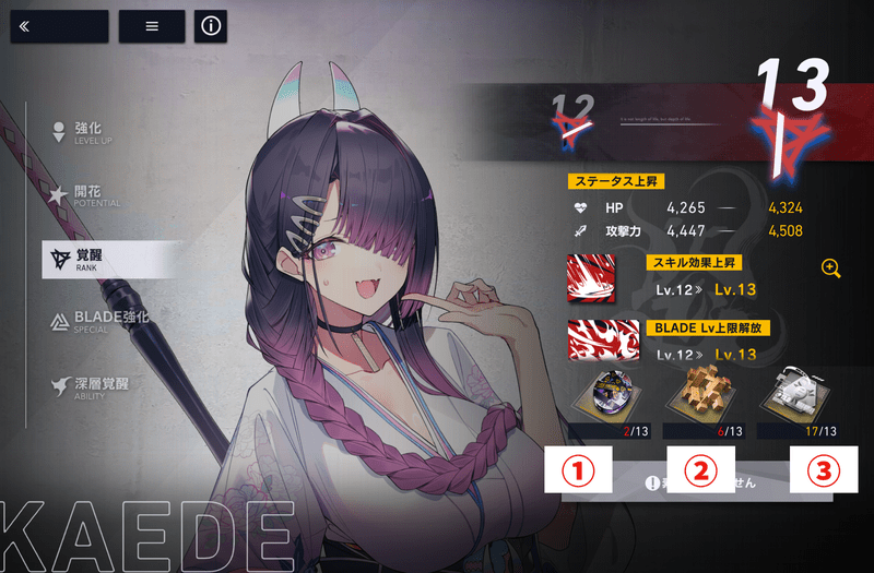また、覚醒RANK上げ,BLADE Lv上げに必要な素材と量は双方同じです。