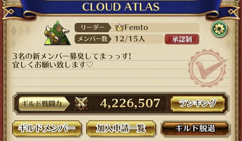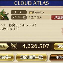 409713日まえ ID:h1j9gige【ギルド名】CLOUD ATLAS