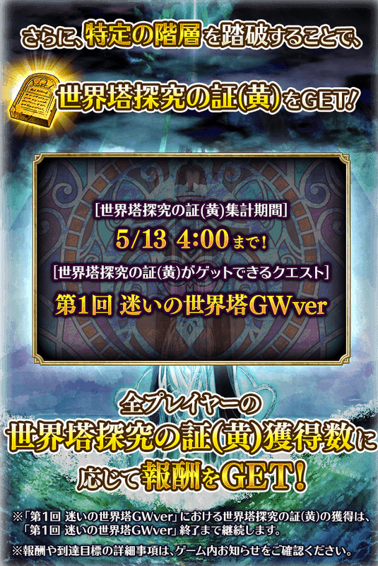 「迷いの世界塔」は階層式のイベントで、上に行くほど強くなる敵を倒し、各階の初回クリアの報酬を獲得するのが目的です。