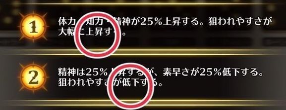 陣形の中にはヘイト(狙われやすさ)が上昇するもの、反対に低下するものがあります。